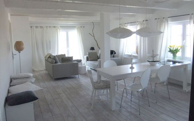 Die Wohnung befindet sich im Erdgeschoss und hat eine Größe von 90 m². Sie finden hier einen großen Wohn-/Essbereich mit offener Küche. Dazu kommen zwei Schlafzimmer mit je einem Doppelbett, die durch Glastüren getrennt sind, ein Bad mit Badewanne sowie ein extra Bad mit Toilette und Dusche.